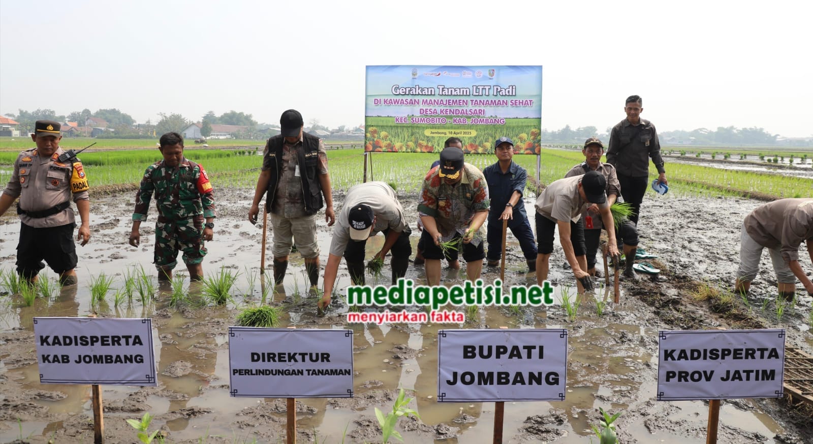 mediapetisi.net – Pemerintah Kabupaten Jombang, Jawa Timur, terus berupaya meningkatkan produksi padi melalui program Luas Tambah Tanam (LTT) dengan pendekatan Manajemen Tanaman Sehat (MTS). Gerakan tanam padi dipimpin Bupati Jombang Warsubi di Dusun Kalimati Desa Kendalsari, Kecamatan Sumobito Kabupaten Jombang. Kamis (10/4/2025)
