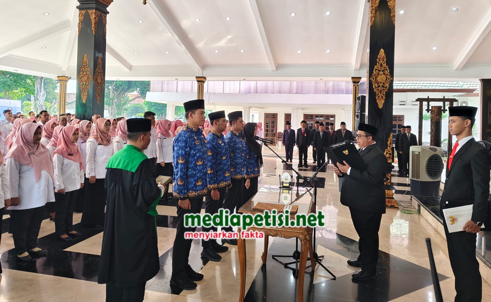 mediapetisi.net – Calon Pegawai Negeri Sipil (CPNS) dan Pegawai Pemerintah dengan Perjanjian Kerja (PPPK) lingkup Pemerintah Kabupaten Jombang menerima Surat Keputusan (SK) Pengangkatan oleh Bupati Jombang Warsubi. Dihadiri Perwakilan Regional II BKN Surabaya, Wakil Bupati Jombang, Sekretaris Daerah, Staf Ahli, Asisten, Kepala OPD, Pimca Bank Jatim, Kepala BUMD dan Kabag. Bertempat di Pendopo Kabupaten Jombang. Jumat sore (2/5/2025)