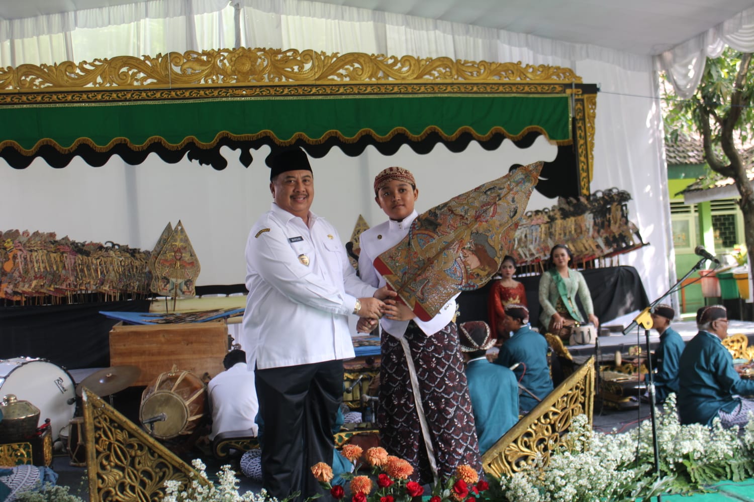 Caption Foto : Bupati Warsubi saat menyerahkan gunungan wayang ke dalang cilik