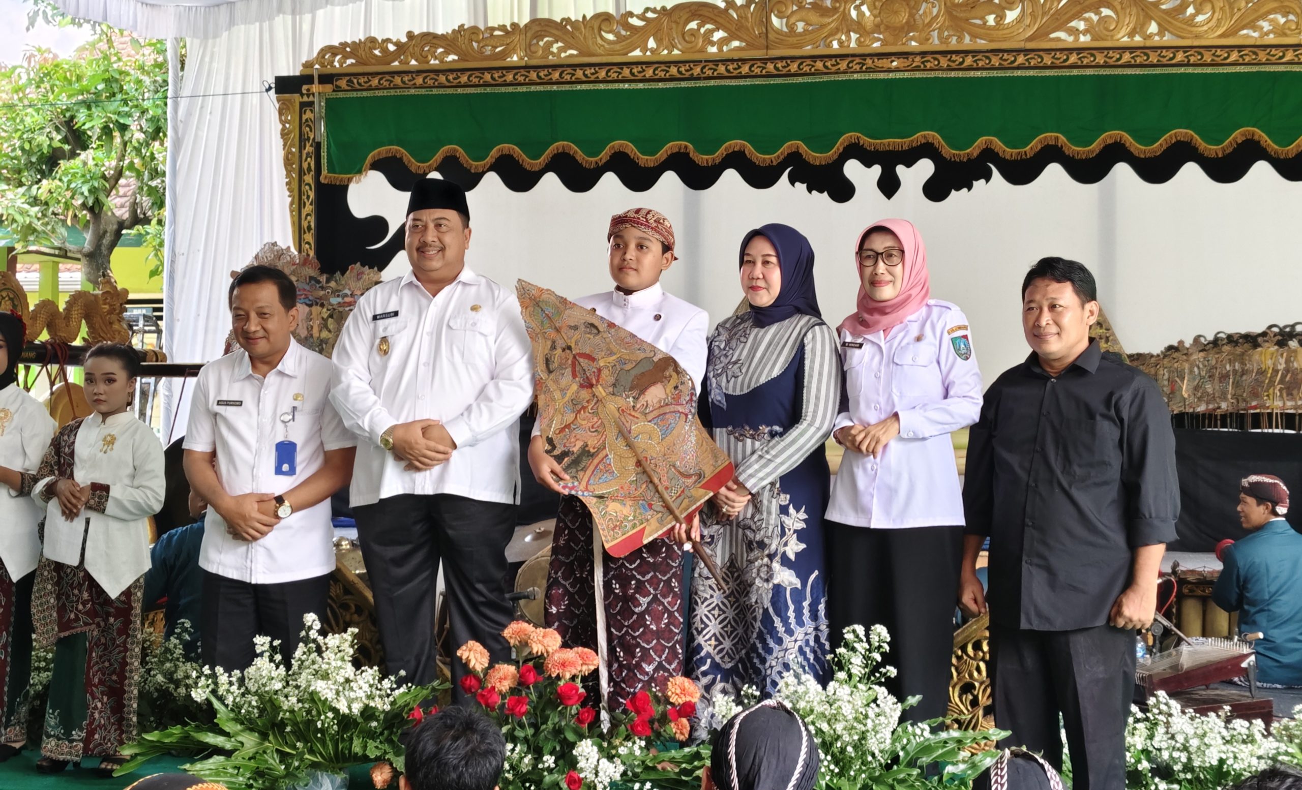 Captiln Foto : Bupati Warsubi bersama istri, Sekda, Kepala Disdikbud, dalang cilik dan Kasek SDN Jombatan 3
