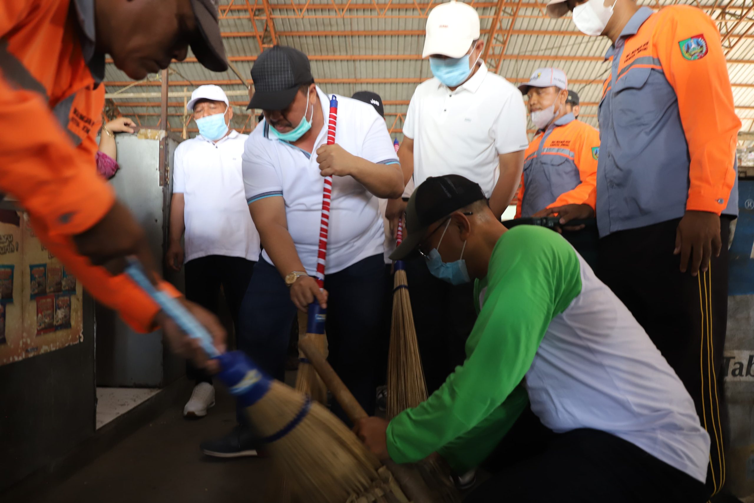 Caprion Foto : Bupati Jombang Warsubi saat memimpin aksi bersih-bersih sampah plastik bersama warga dan pedagang pasar.