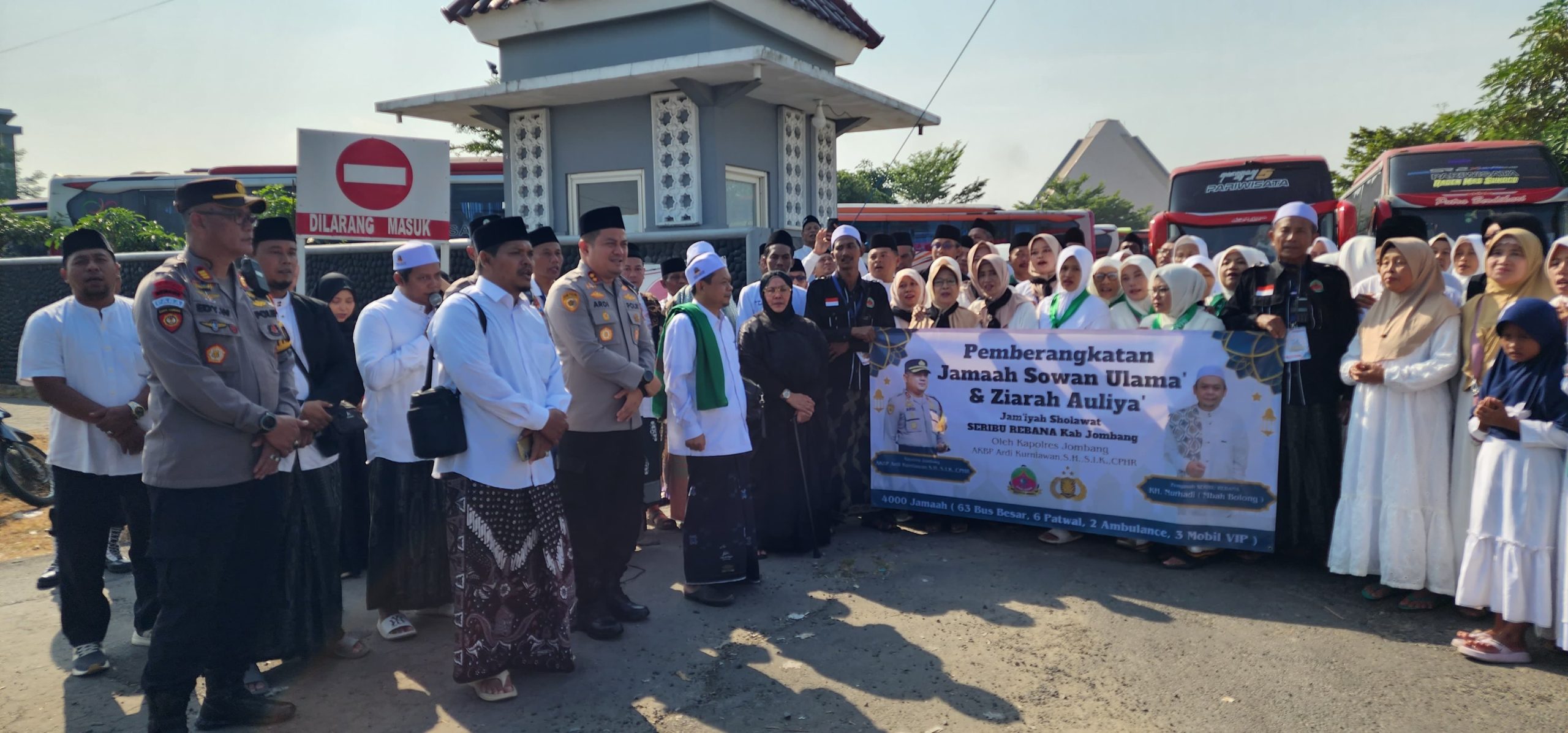 Caption Foto : Kapolres Jombang AKBP Ardi Kurniawan didampingi Mbah Bolong dan Gus Misbah saat memberangkatkan ribuan jemaah Serban