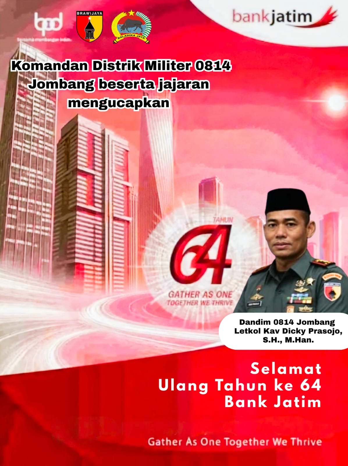 Komandan Komando Distrik Militer 0814 Jombang mengucapkan Selamat Ulang Tahun Bank Jatim ke 64