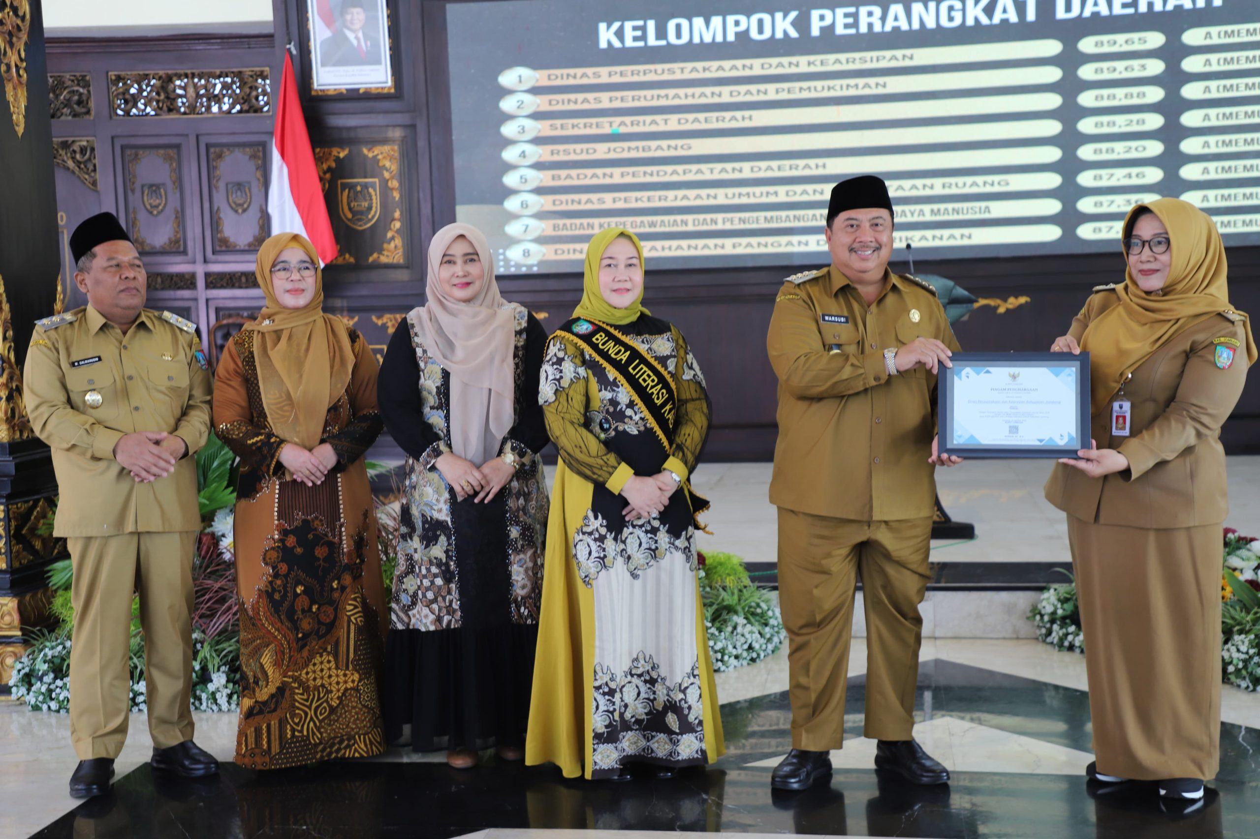 Caption Foto : Bupati Jombang Warsubi saat menyerahkan oenghargaan kepada Plt Kadis Perpustakaan dan Kearsipan