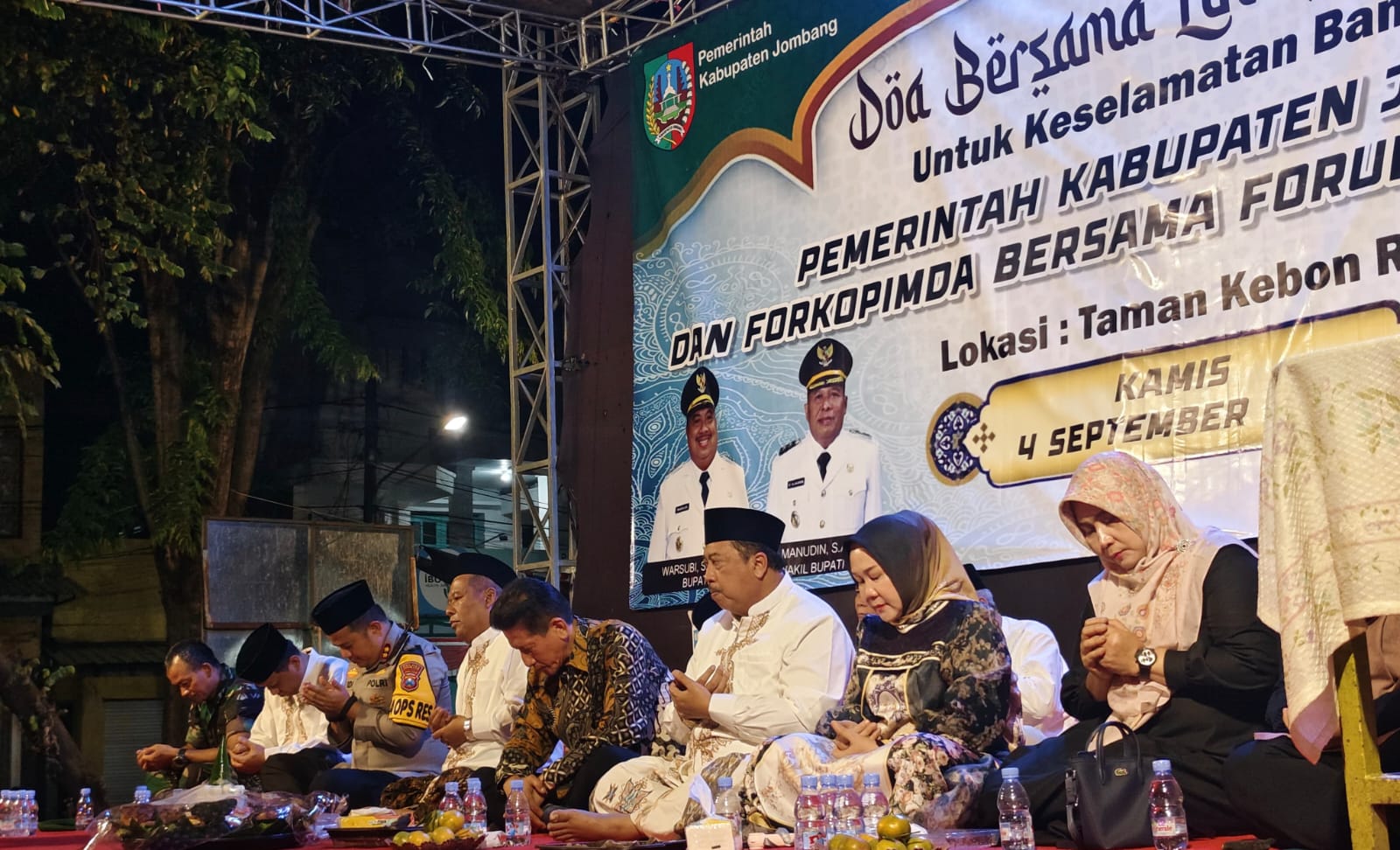 mediapetisi.net – Suasana penuh khidmat menyelimuti Taman Kebonrojo Jombang saat digelar Tasyakuran dan Doa Bersama untuk Keselamatan Bangsa yang diinisiasi Pemerintah Kabupaten Jombang bersama Forum Rakyat Jombang. Acara ini dihadiri Bupati Jombang Warsubi, Wakil Bupati Salmanudin, beserta jajaran Forkopimda, tokoh masyarakat, pimpinan organisasi masyarakat dan LSM, serta warga Jombang. Kamis malam (4/9/2025)