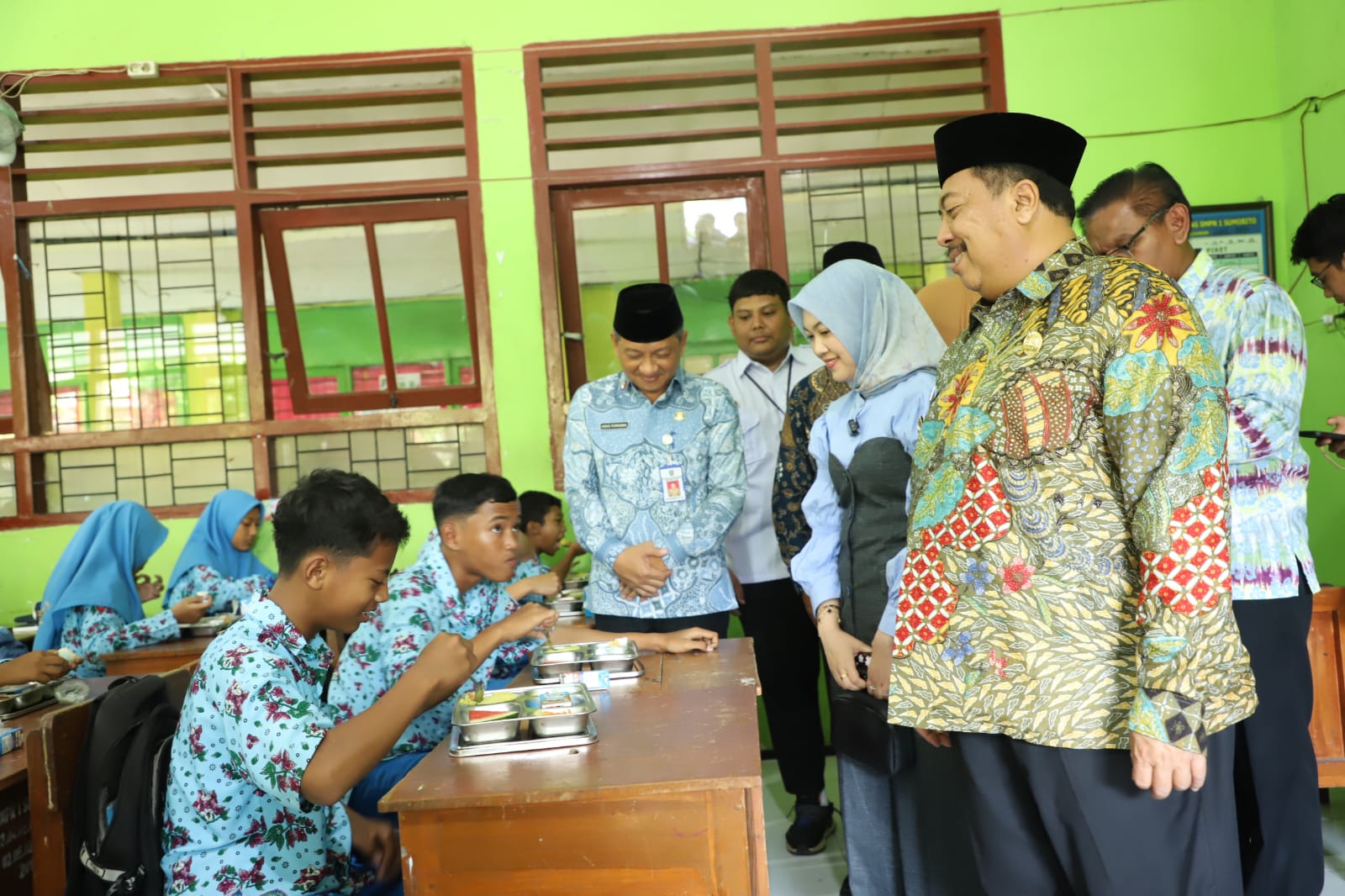 Selain fokus pada program gizi, Bupati Warsubi turut meninjau kondisi sarana dan prasarana pendidikan. Ia masuk ke beberapa ruang kelas yang baru direhabilitasi untuk melihat langsung situasi belajar siswa.