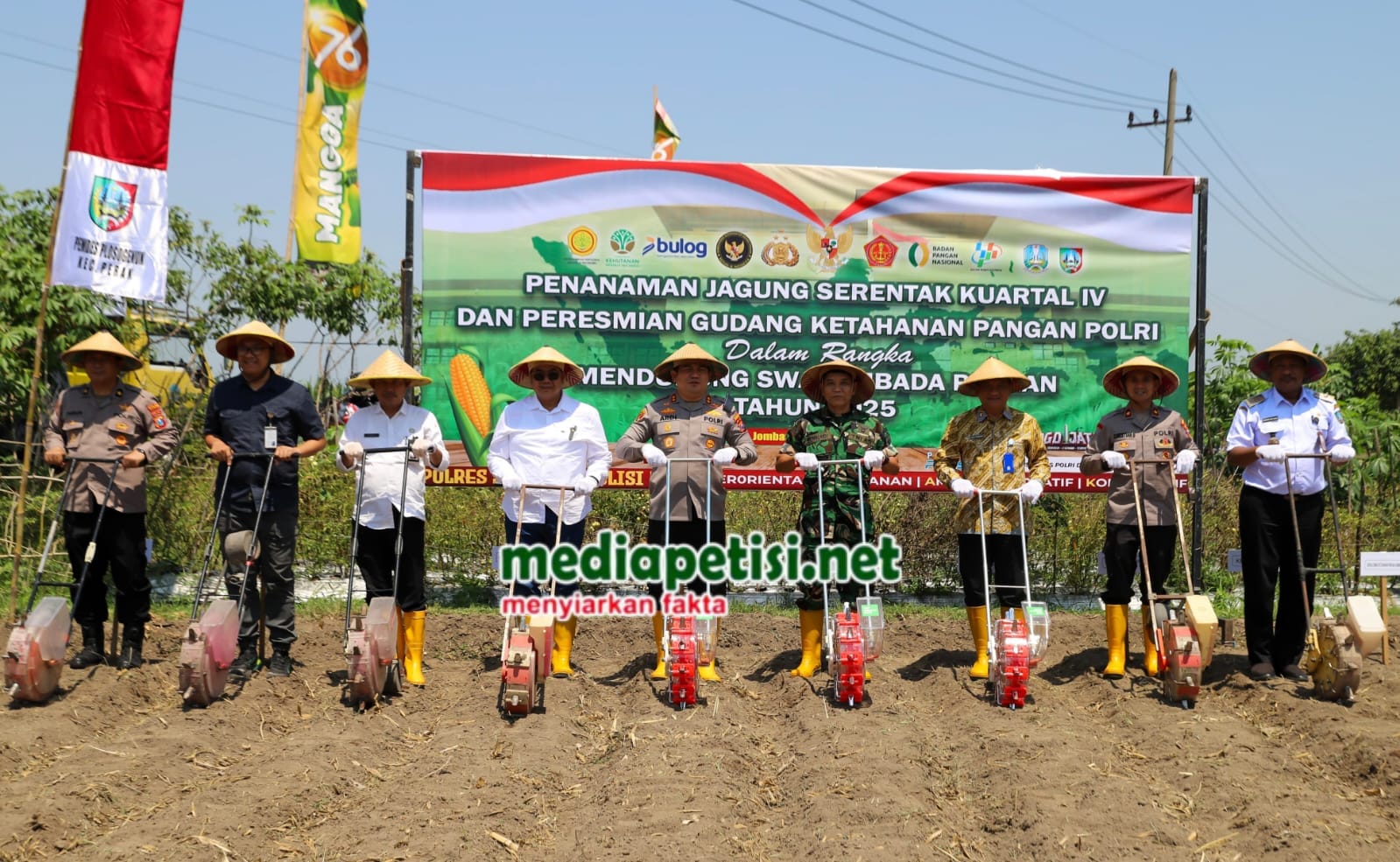 mediapetisi.net – Dalam upaya memperkuat ketahanan pangan nasional, Polres Jombang berkolaborasi dengan Kodim 0814/Jombang, Pemerintah Kabupaten Jombang, Bulog, serta kelompok tani setempat melaksanakan kegiatan penanaman jagung serentak di Desa Plosogenuk, Kecamatan Perak, Kabupaten Jombang. Rabu (8/10/2025).