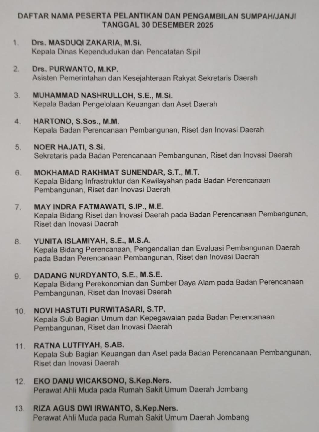 mediapetisi.net – Menjelang akhir tahun, Pemerintah Kabupaten Jombang melalui Badan Kepegawaian dan Pengembangan Sumber Daya Manusia (BKPSDM) melaksanakan pelantikan sejumlah pejabat eselon II B setingkat kepala OPD oleh Bupati Jombang Warsubi. Dihadiri Sekretaris Daerah Kabupaten Jombang Agus Purnomo, Asisten, dan Kepala OPD. Bertempat di ruang Swagata Pendopo Kabupaten Jombang. Selasa (30/12/2025)