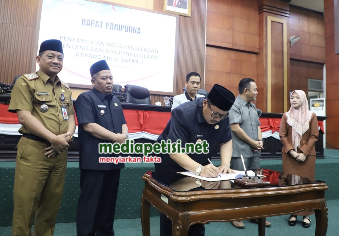 Caption Foto : Bupati Warsubi dan Pimpinan DPRD saat menandatangani berita acara paripurna