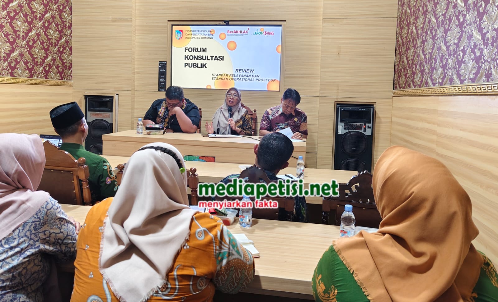 mediapetisi.net – Dinas Kependudukan dan Pencatatan Sipil (Dispendukcapil) Kabupaten Jombang gelar Forum Konsultasi Publik (FKP) Review Standart Pelayanan dan Standart Operasional Prosedur (SOP) Tahun 2026 dibuka oleh Sekretaris Dispendukcapil Jombang Dwi Ariyani. Dihadiri perwakilan OPD terkait dilingkup Pemkab Jombang, Akademisi, Kemenag, Perwakilan RSUD Jombang, Perwakilan Camat Jombang, Peterongan dan Diwek, LSM serta Media. Bertempat di ruang rapat Dispendukcapil Jombang. Kamis (29/1/2026)