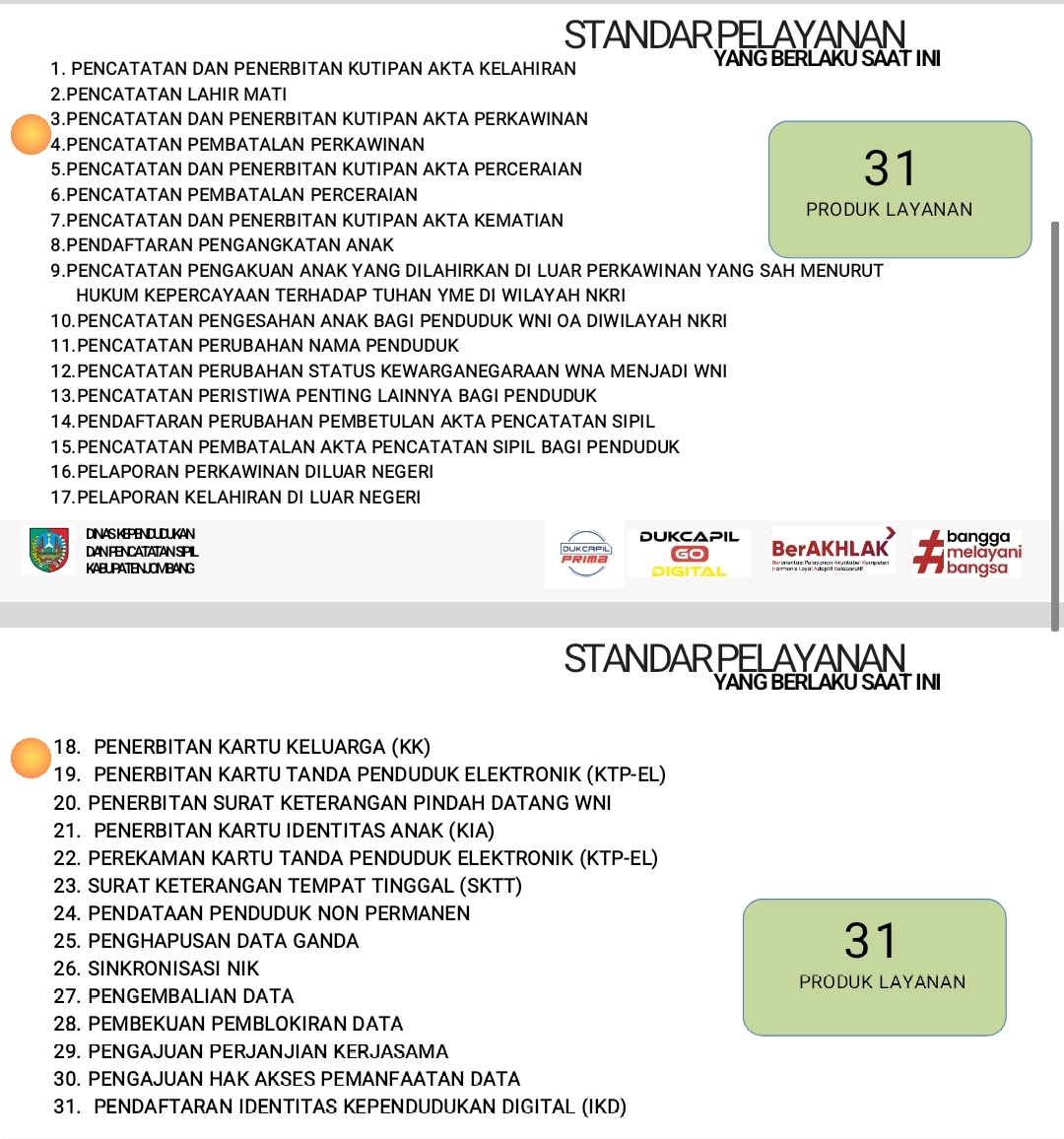 “Sedangkan standar dan produk layanan yang berlaku saat ini ada 31 produk layanan. Seluruh pelayanan Adminduk (Administrasi Kependudukan) di Kabupaten Jombang diselenggarakan dengan prinsip mudah, cepat, dan gratis (tanpa biaya). Untuk Layanan Digital (Dukcapil Digital) yakni pendaftaran dan aktivasi KTP Digital melalui aplikasi “Identitas Kependudukan Digital” di Playstore, dilanjutkan verifikasi ke kantor Dispendukcapil. Jadi pengajuan dokumen melalui web resmi/aplikasi/WhatsApp (sesuai arahan petugas) untuk pengurusan Akta dan KK tanpa perlu antre di kantor,” terangnya.
