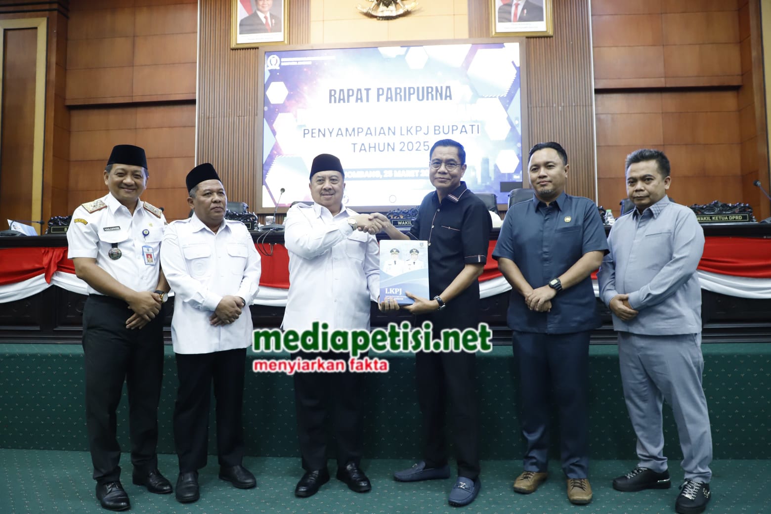 mediapetisi.net – Rapat Paripurna DPRD Kabupaten Jombang Penyampaian LKPJ (Laporan Keterangan Pertanggungjawaban) Bupati Tahun 2025 dipimpin Ketua DPRD Hadi Atmaji. Dihadiri Wakil Bupati, Forkopimda, Wakil Ketua dan Anggota DPRD, Sekda, Staf Ahli, Asisten, Kepala OPD, Direktur RSUD, Direktur BUMD, Kabag dan Camat. Bertempat di ruang Paripurna Kantor DPRD Jombang. Rabu (25/3/2026)