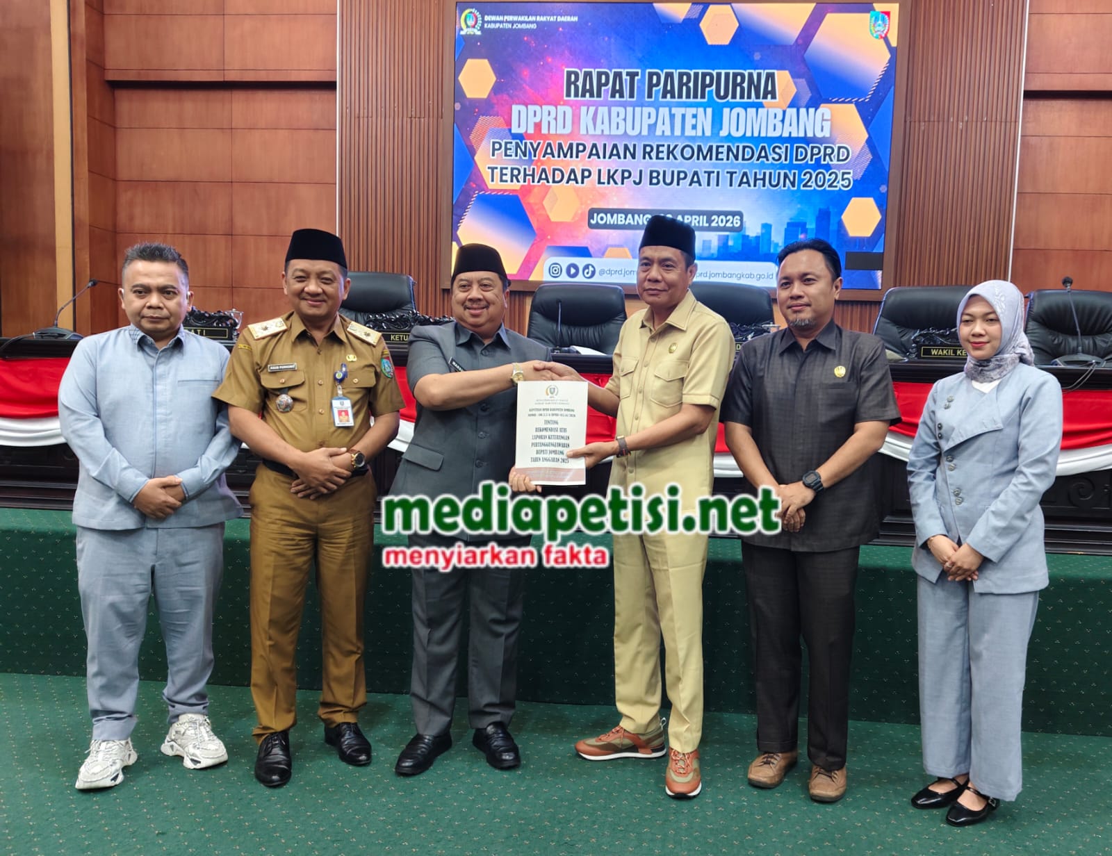 mediapetisi.net – Rapat Paripurna DPRD Kabupaten Jombang Penyampaian Rekomendasi DPRD terhadap LKPJ (Laporan Keterangan Pertanggungjawaban) Bupati Tahun 2025 dipimpin Ketua DPRD Hadi Atmaji. Dihadiri Bupati Warsubi, Wakil Ketua dan Anggota DPRD, Perwakilan Forkopimda, Sekda Agus Purnomo, Asisten, Staf Ahli, Kepala OPD, Direktur BUMD, Kabag dan Camat. Bertempat di ruang Paripurna kantor DPRD Kabupaten Jombang. Senin (20/4/2026)