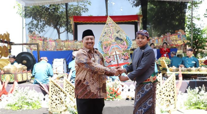 Caption Foto : Bupati Jombang Warsubi saat serahkan gunungan ke Dalang Cilik Ki Amora Lingga Abinaya