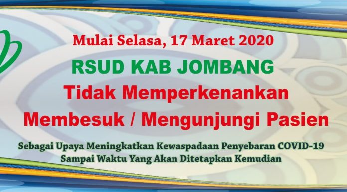 mediapetisi.net - Manajemen Rumah Sakit Umum Daerah Kabupaten Jombang tidak memperkenankan membesuk/ mengunjungi pasien yang sedang menjalani perawatan inap sebagai upaya meningkatkan kewaspadaan penyebaran corona virus diseases (Covid-19) mulai tanggal 17 Maret 2020 sampai waktu akan...