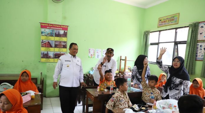 Caption Foto : Pj Bupati Jombang didampingi Kepala Desa Kepatihan saat meninjau Pelajar SD Kepatihan ikuti simulasi makan siang gratis