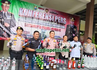 Caption Foto : Waka Polres Jombang saat pimpin konferensi pers mediapetisi.net - Polres Jombang terus berupaya memberantas peredaran minuman keras (miras) ilegal di wilayah kabupaten Jombang. Kali ini Tim Sus Saber Miras Satuan Samapta berhasil...