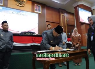 Caption Foto : Bupati Jombang Warsubi saat menandatangani persetujuan Perda PDRD