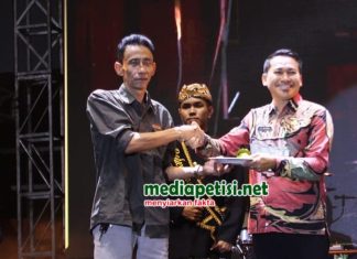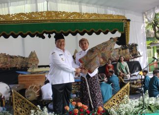 Caption Foto : Bupati Warsubi saat menyerahkan gunungan wayang ke dalang cilik